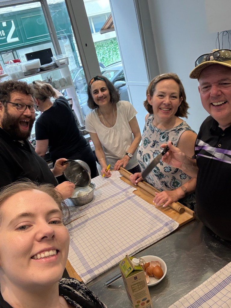 By this point, we finally circled back to the hotel to check in properly before heading out for one last adventure. One of Tazia’s travel traditions is to take a local cooking class wherever she goes, so tonight’s plan was perfect. At Nabiel Wiener Küche, we joined Chef Nabiel for a small-group lesson on Austrian classics—schnitzel and kaiserschmarrn. Cooking, eating, and laughing together was the perfect way to close out our first day.
